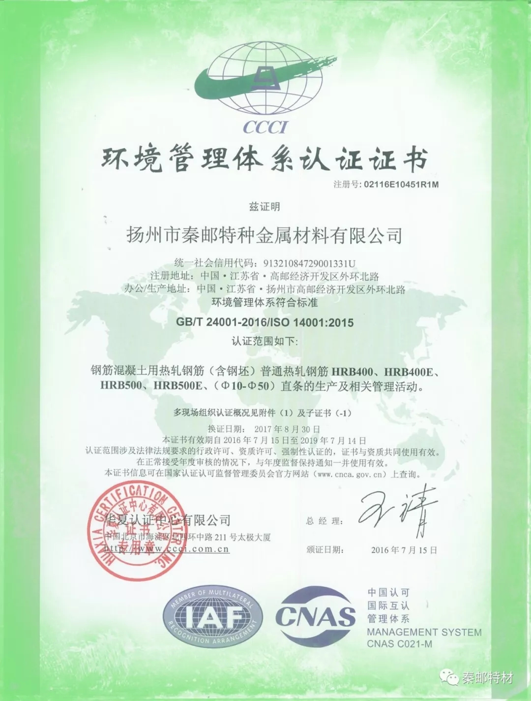 環(huán)境管理體系認(rèn)證證書